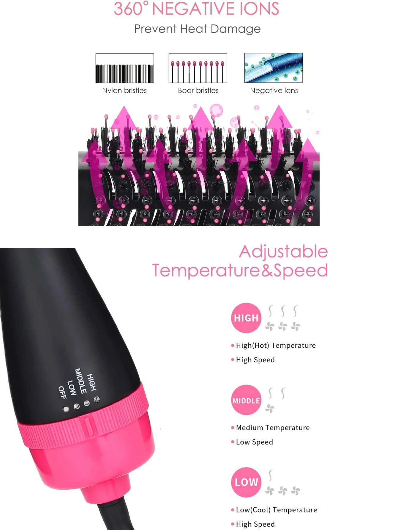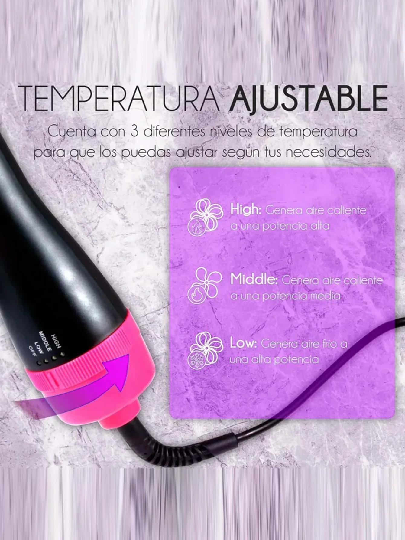 *3 ajustes de temperatura y 2 velocidades: baja: baja temperatura con alta velocidad, para usar en el extremo para peinar tu cabello; medio: temperatura media con baja velocidad, para un control más fino o preciso para el peinado; ALTA: alta temperatura con alta velocidad, para cabello áspero, seco o grueso