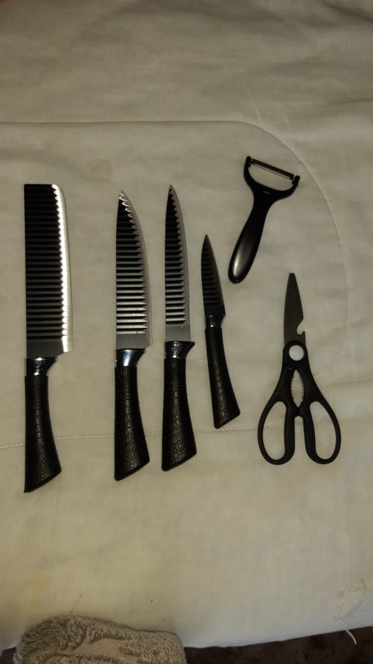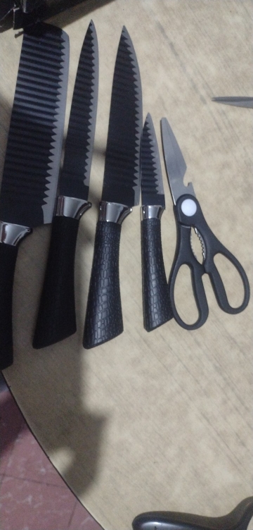 Este conjunto de cuchillos de Corte tiene seis recubrimientos no pegajosos, las cuchillas son afiladas y el diseño negro es hermoso. El mango ergonómico garantiza una mayor seguridad operativa, un mejor rendimiento y una mayor precisión de corte de carne.