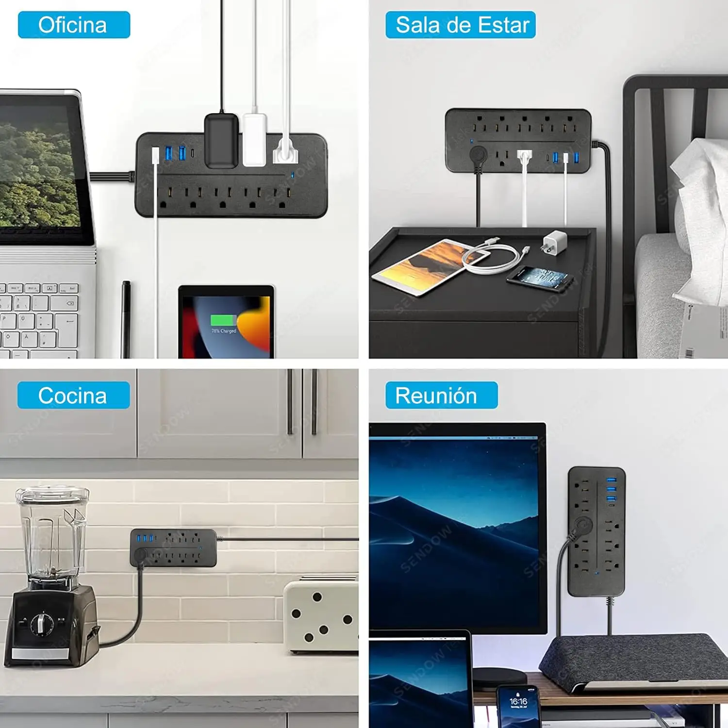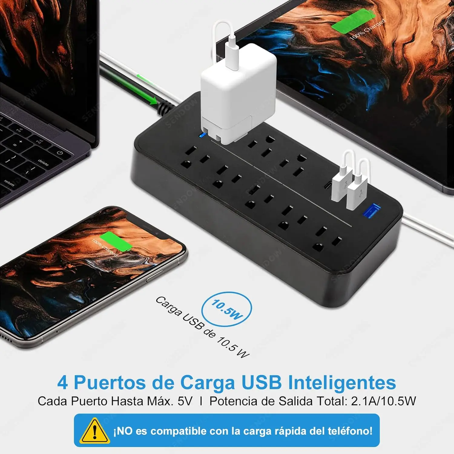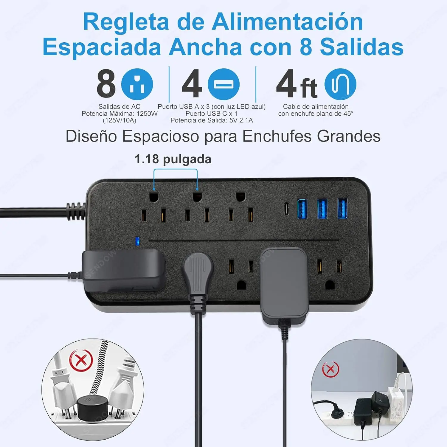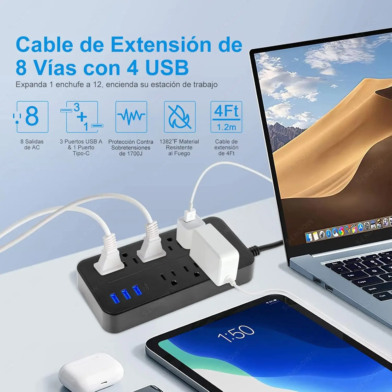 USB Multicontacto, Regleta de 1,2 m, 8 Salidas, 3 Puertos de Carga USB, (5 V / 2 A), 1 Puerto Type-C, Conector múltiple