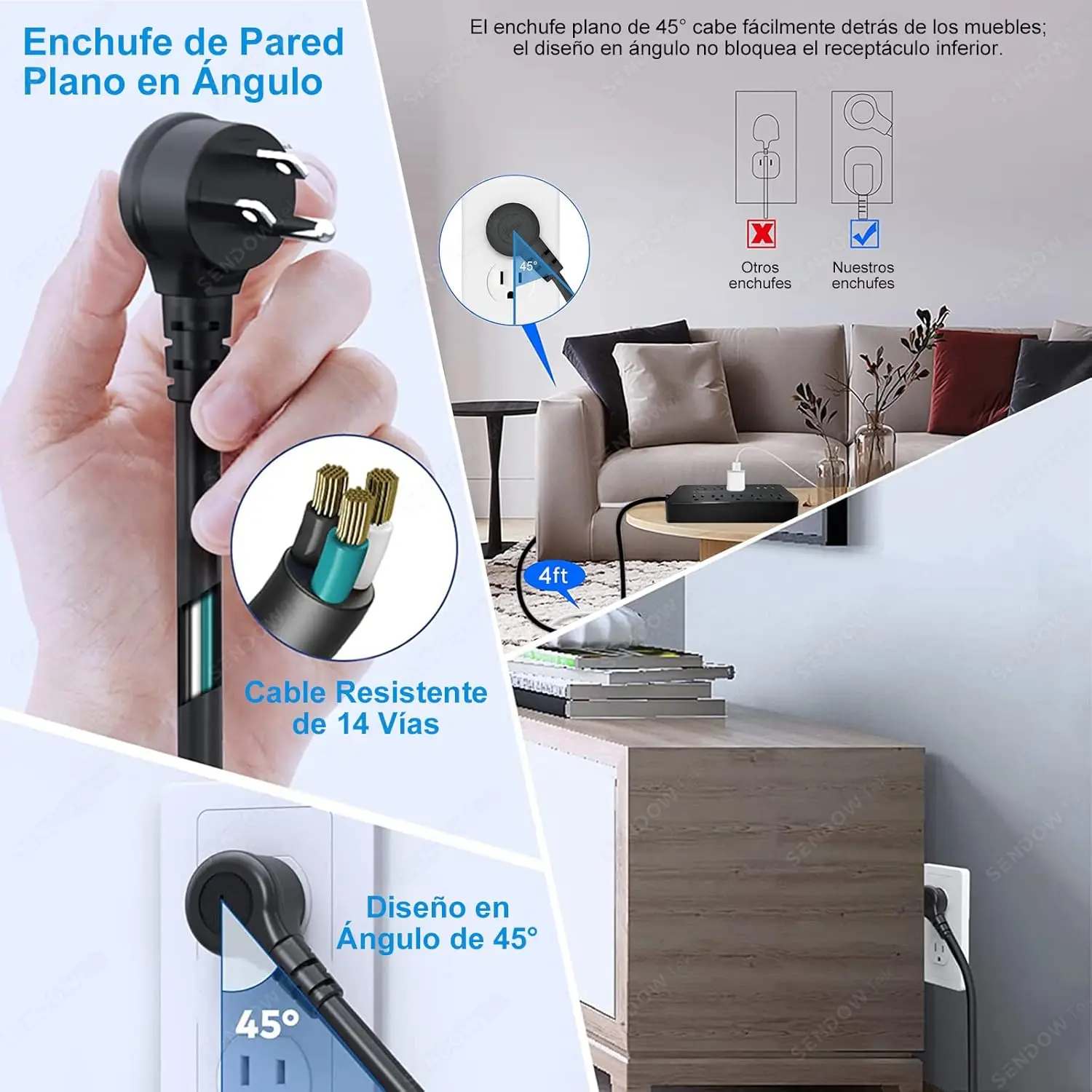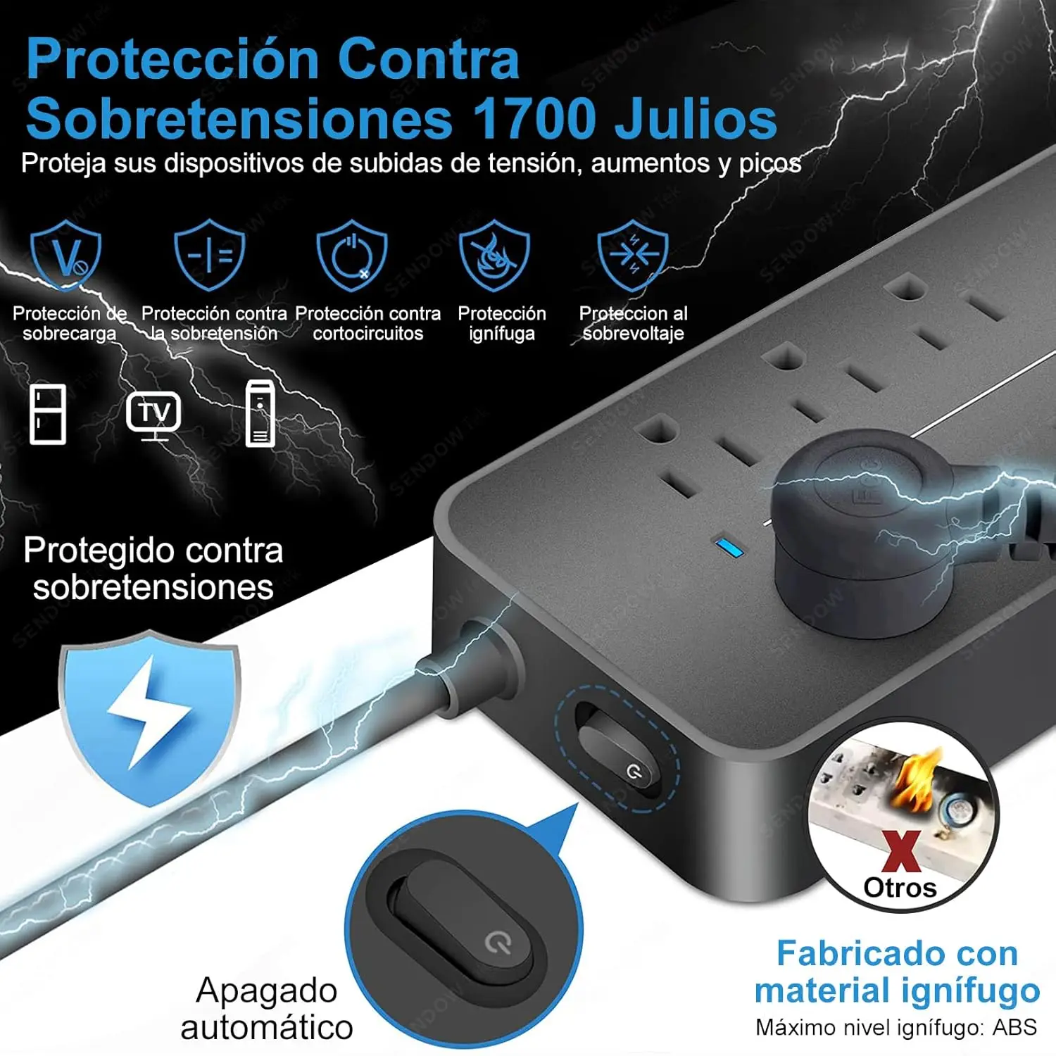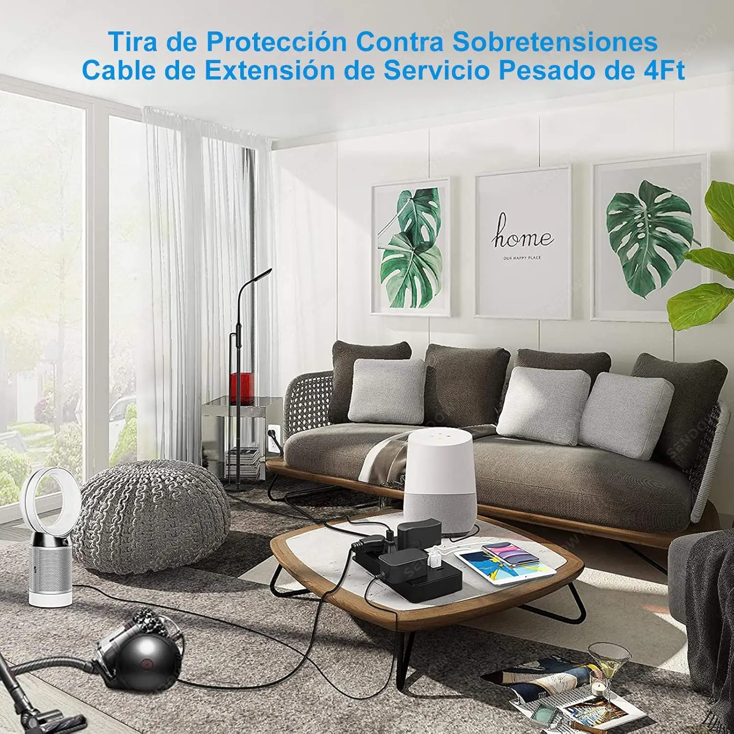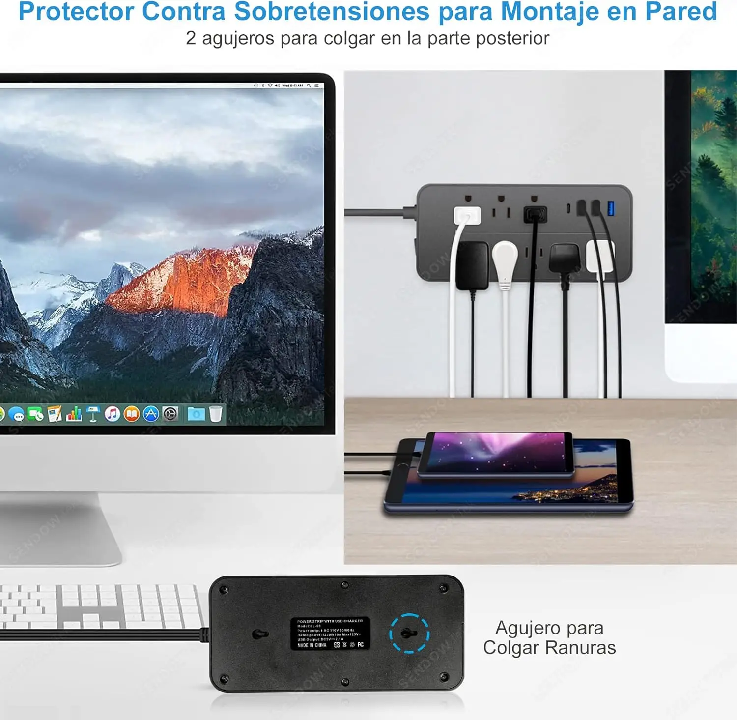 USB Multicontacto, Regleta de 1,2 m, 8 Salidas, 3 Puertos de Carga USB, (5 V / 2 A), 1 Puerto Type-C, Conector múltiple